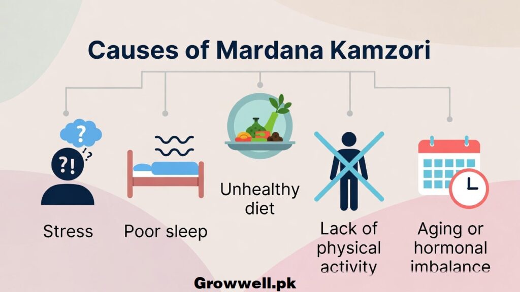 Mardana Kamzori ke peeche kai wajah ho sakti hain. Kuch causes physical hoti hain jaise diabetes, high blood pressure, hormone imbalance ya blood circulation ka masla. Kuch logon mein ye issue mental stress, anxiety ya depression ki wajah se bhi develop hota hai. Aaj kal ka unhealthy lifestyle, smoking, exercise ki kami aur poor diet bhi is problem ko trigger kar sakte hain. Is liye zaroori hai ke is issue ko sirf ek kamzori na samjha jaye, balkay ek health condition ke tor par dekha jaye.